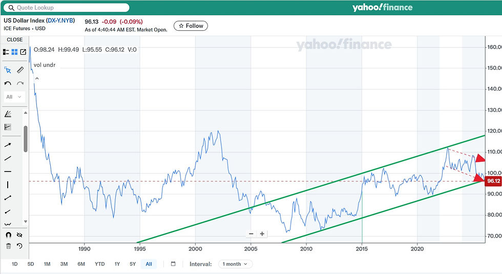 ערב טוב הייטקיסטים שלי. טוב אז נכון שהדולר נחלש כבר שלש שנים מול כל המטבעות בעולם (וגם מול השקל) אבל הרי כתבנו כבר כמה פעמים, פיקסל על גבי בלוג, שמגמה לא מודדים מהשער הגבוה לשער הנמוך אלא משני קווי מגמה אחד משתי נק' המקסימום והשני משתי נק' המינימום. אה ועוד משהו, קו המגמה ארוך הטווח חשוב יותר מהקצר טווח. ניתן לדמות את המגמה הקצרה למזג האוויר לעומת המגמה הארוכה שהיא למעשה האקלים. אז נכון שבשנים האחרונות עוברים על העולם שלנו כמה שינויים חדשים כמו דה גלובליזציה (טראמפ) או כמו AI אשר מג'נרט לנו את המוח, אפילו יש שינויי אקלים בכדור שלנו. אבל המגמה, המגמה! לדעתי האימפריה לא קורסת. לפוסט קודם שלי בנושא מדידת מגמה. לא חושב שנחוץ לעשות גילוי נאות על פוסט קצר שכזה, אז רק אפנה אתכם לעמוד הגילוי הנאות הכללי בבלוג שלי.
